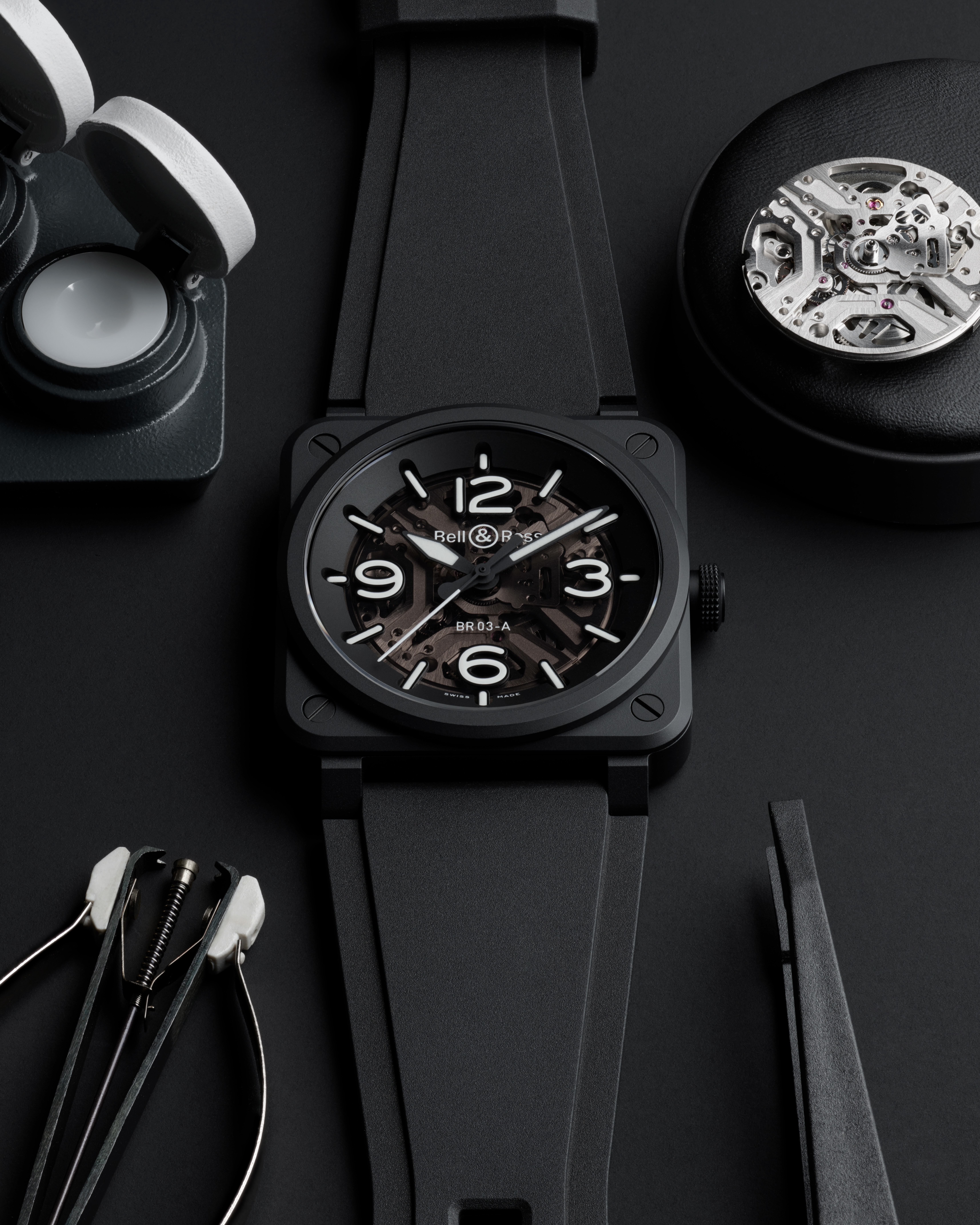 Bell & Ross BR-03 Skeleton Black Ceramic 的 41 毫米黑色陶瓷表壳散发当代前卫气质,烟燻色蓝宝石玻璃表盘镶饰的黑色「baignoire风格」时标,後者填上泛绿光的白色 Super-LumiNova (SLN)夜光物料,表盘并透视 X 形镂空机芯结构。