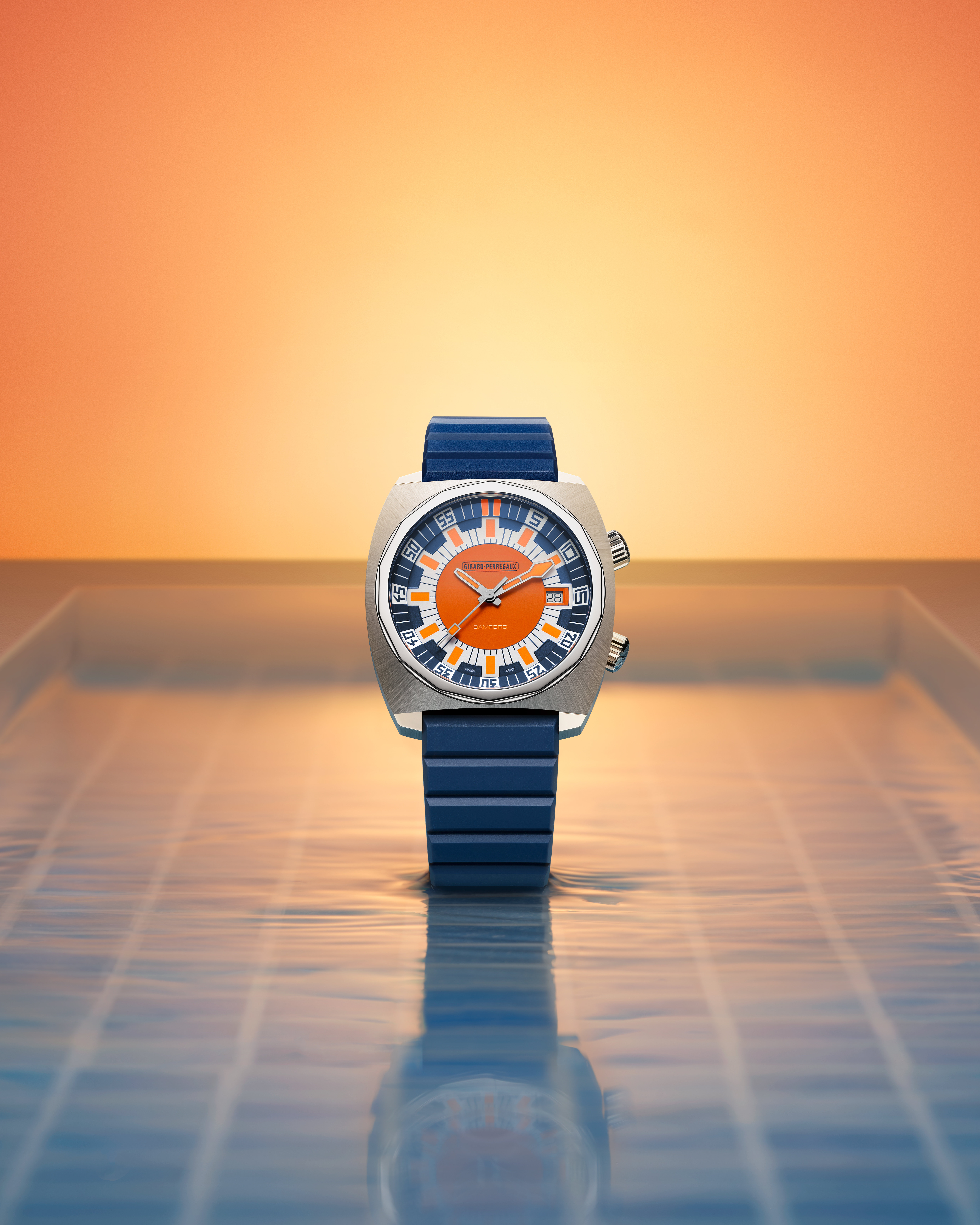 Girard-Perregaux新款Deep Diver腕表的设计魅力与其机械造诣一样,令人叹服,它大胆融合了蓝、橙、白三个流行色调,碰撞出非凡的视觉张力,并配备日期视窗与旋转内表圈,後者可通过2点位置的表冠进行调节。这款腕表的指针与时标均涂覆夜光材料,在暗光环境下会散发出明亮的蓝色光芒。数位时标的设计灵感汲取自原版的复古未来主义风格。
