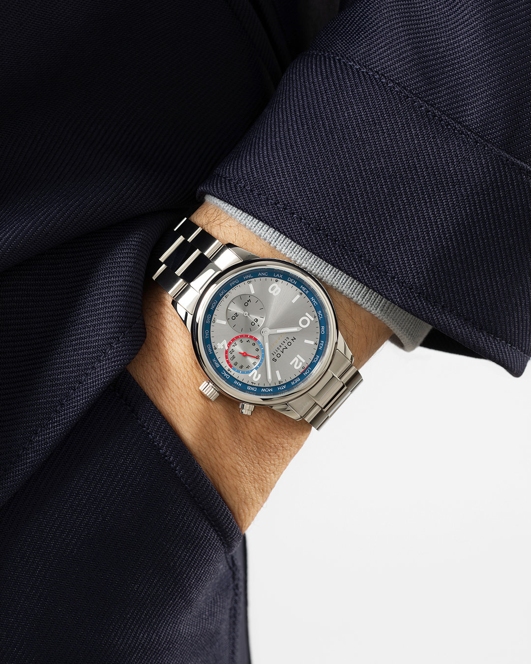 NOMOS Glashütte Club Sport Neomatik Worldtimer,搭载具备世界时间功能的新型自动机芯 DUW 3202,为日常生活和全球旅行而生。城市标盘环绕表盘外圈,以代码表示 24 个不同时区;12 点处的红线指向目前选定时区。3 点钟方向的 24 小时显示窗则用於呈现第二时区时间——既可显示旅行途中的家乡时间,也能同步您须频繁联络的另一地区的当下时刻。