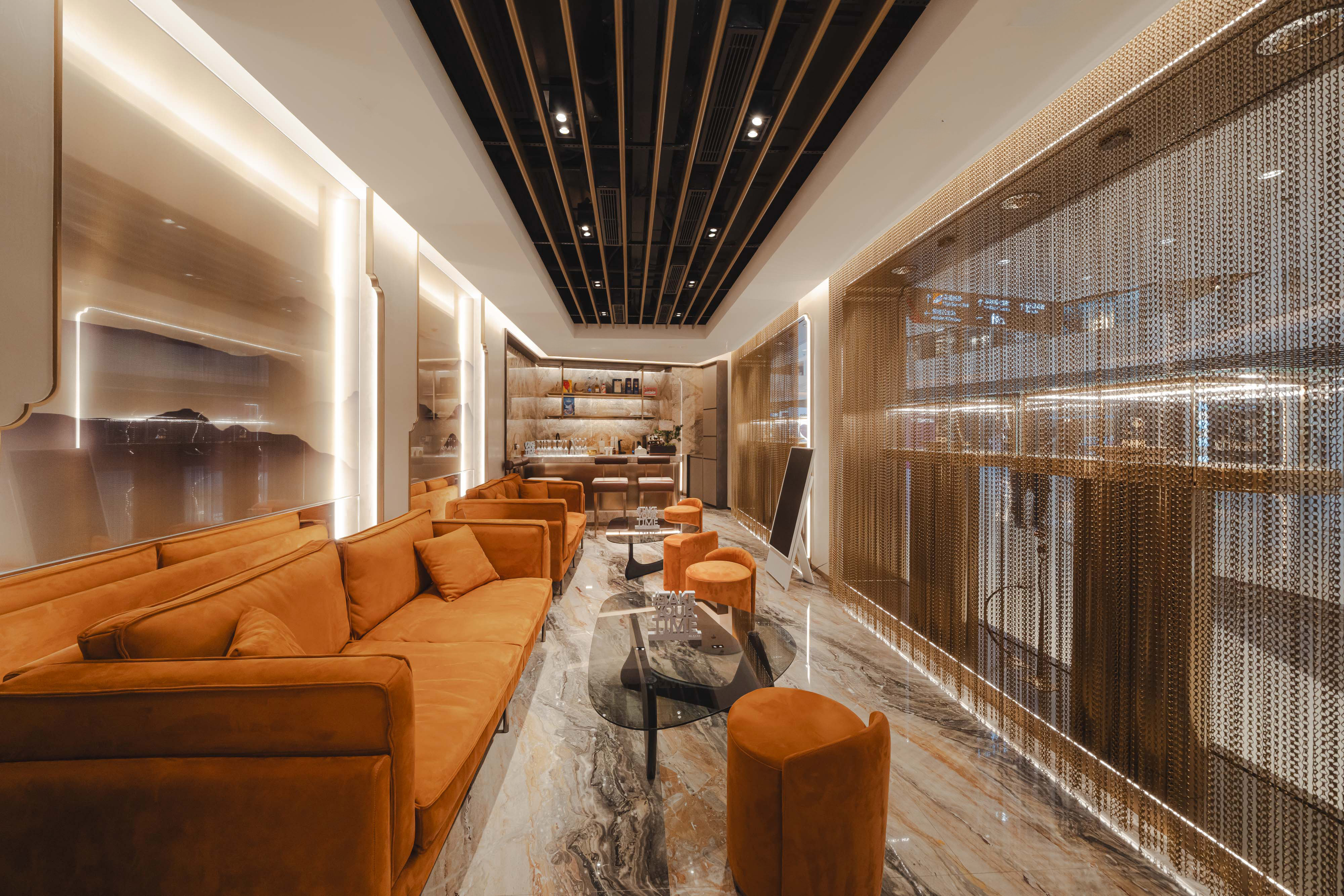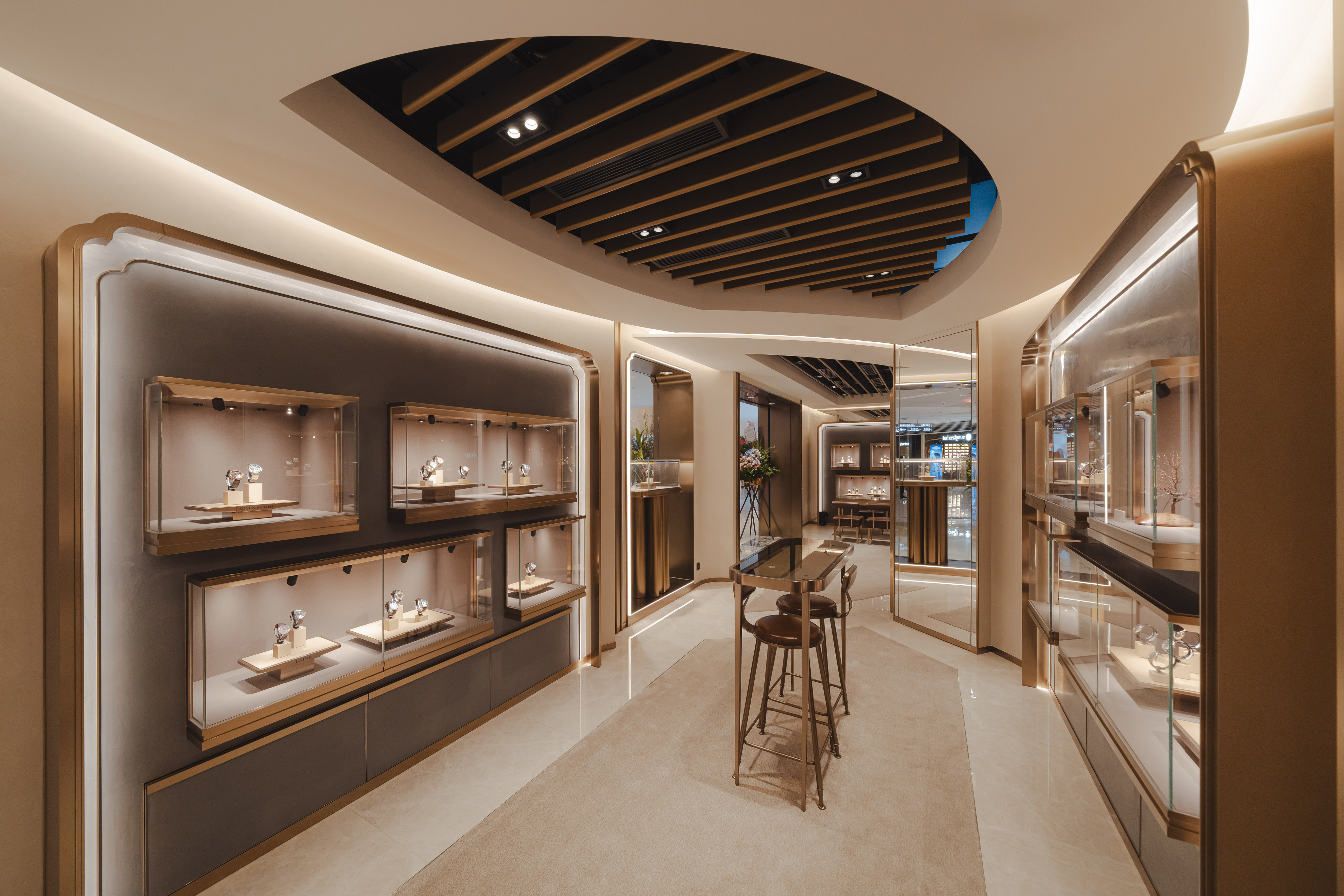 店舖以古铜金色为主调,融合现代极简美学与中式传统精髓,延续古典庭院曲线的精雕之美,并加入经典通花铁闸元素,勾勒出跨越古今的雅致意境。